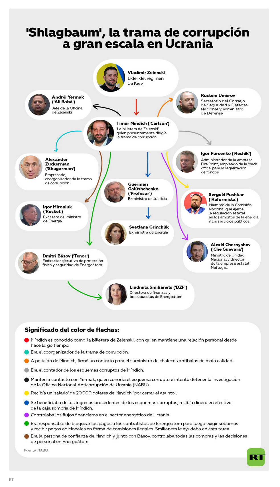 Los organismos anticorrupción indicaron que han ampliado el círculo de sospechosos en el caso Midas. Se trata de la investigación de red de sobornos en el sector energético, en la que están implicadas personas cercanas a Vladímir Zelenski, entre ellas el empresario y amigo del jefe del régimen de Kiev, Timur Míndich, y el exjefe de su Oficina, Andréi Yermak.