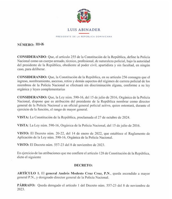 “La disposición se fundamenta en lo establecido en los artículos 255 y 256 de la Constitución de la República y en la Ley núm. 590-16, Orgánica de la Policía Nacional, que otorga al presidente la atribución de nombrar al director general de la institución entre oficiales generales activos. Asimismo, el decreto deroga el artículo 1 del Decreto núm. 557-23”, reseña el comunicado de prensa enviado desde la Presidencia de la República.
