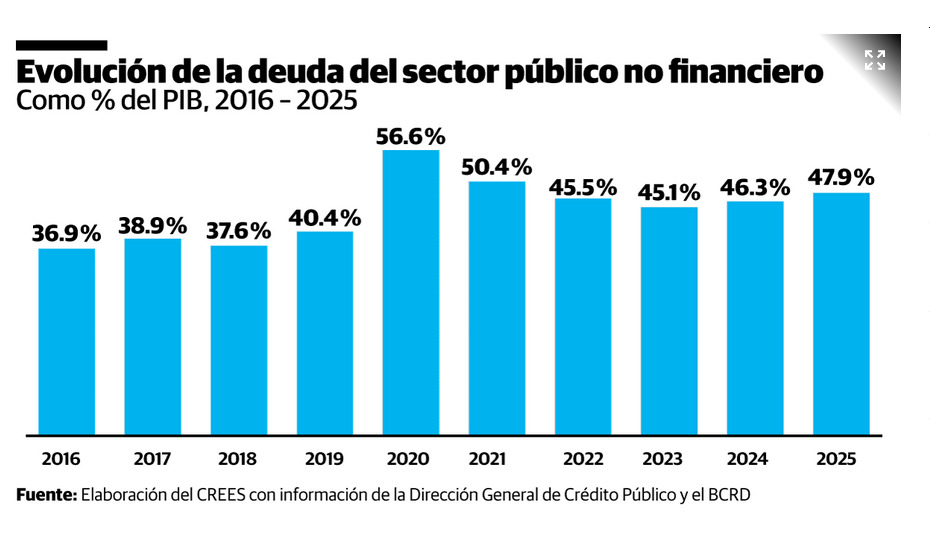 SANTO DOMINGO.- De acuerdo con la Dirección General de Crédito Público, al cierre del 2025, la deuda del Sector Público No Financiero (SPNF) fue de 61,549.9 millones de dólares, es decir, 47.9 % del PIB. Este nivel representa un incremento respecto al 2024, donde se situó en 46.3 %, y continúa la tendencia creciente que se puede ver durante todo el período.