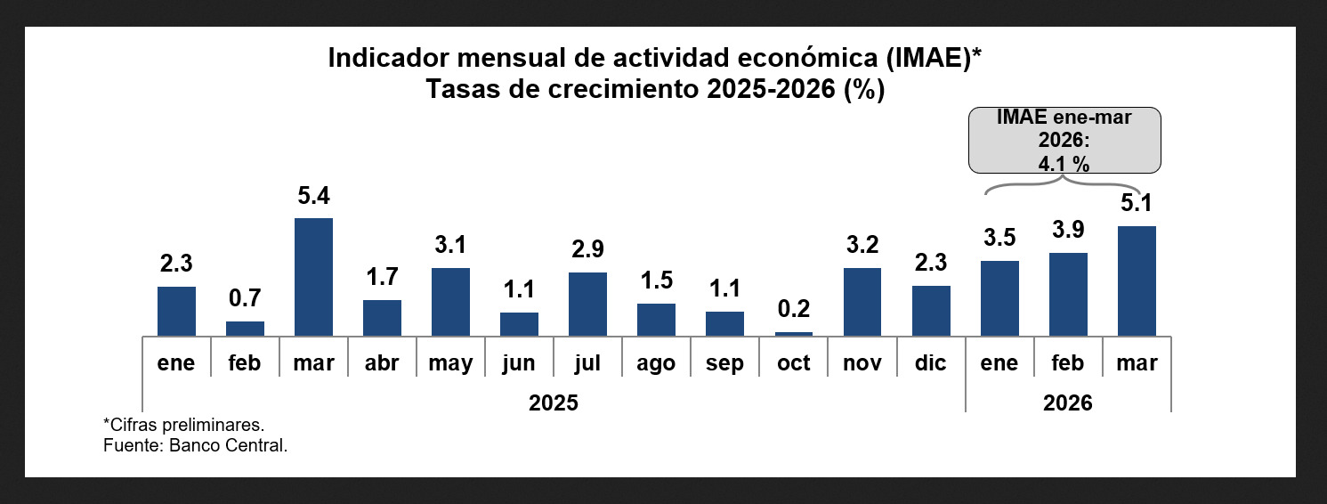 SANTO DOMINGO.- El indicador mensual de actividad económica (IMAE) de la República Dominicana registró un crecimiento del 5.1 % interanual en marzo, ubicando en 4.1 % el promedio acumulado durante el primer trimestre de este año, informó este jueves el Banco Central (BCRD).